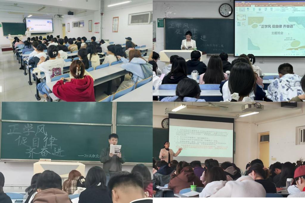 全员育人,共建学风。学院党政齐抓共管,以课堂考勤为切入点,构建“学院领导+专业教师+辅导员+班主任+班长”五位一体联动常态化机制。严格落实“两早两晚”、课堂双向考勤、检查课堂教学秩序,周汇总、月通报,强化课堂教学管理。学院先后召开班主任工作培训会、“正学风促自律齐奋进”学风建设主题班会,认真开展校纪校规教育,集体学习《学生违纪处理办法》《大学生日常行为规范》等,使制度规范内化于心、外化于行。