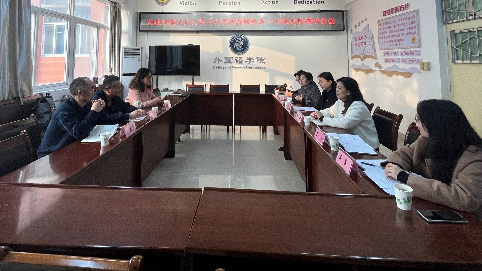徐鹏对学院的接待表达了感谢,并详细介绍了甘肃农业大学人文学院的基本情况、学科专业布局、课程设置和办学特色等。学院领导详细介绍了学校的发展历程、外国语学院的历史沿革、组织架构、人才培养模式、科研成就、师资力量以及实验室建设等情况。