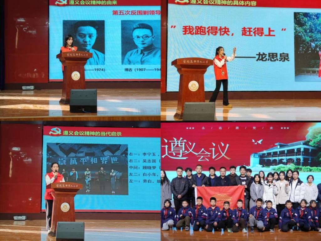 在宝鸡高新第九小学报告厅,2024年全国大学生遵义会议精神志愿宣讲团、开元文学与新闻传播学院“红城毅行”志愿团队以“传承遵义会议精神,激发奋进力量”为主题开展宣讲。宣讲团成员从习近平总书记视察遵义时的重要指示入手,采用诗词朗诵、人物介绍、知识问答等形式讲述了遵义会议精神的形成阶段、具体内涵和当代传承,号召大家学习老一辈革命家对崇高理想的矢志坚守和实事求是的科学态度,树立远大理想,练就过硬本领,争做爱党爱国、自立自强、奋发向上的新时代好少年,努力成长为堪当民族复兴重任的栋梁之才。