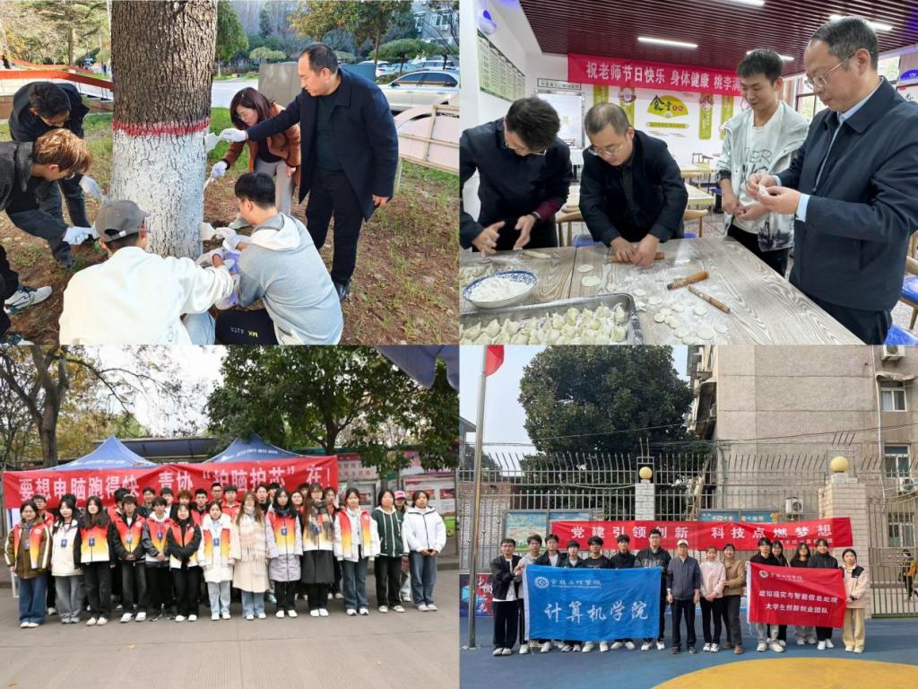 党建领航赋新能,护芯启智展风华。11月8日,学院组织学生党员前往宝电幼儿园、附属学校,积极开展以“党建引领,科技创新,研学课堂”为主题的实践活动。通过无人机、六足机器人、VR眼镜等科技作品的演示,为小朋友们开启了一扇通往科技世界的大门。研学活动为孩子们种下了科技的种子,让科技启蒙之光在童年之路熠熠生辉。11月25日、12月5日,学院青年志愿者协会分别于石鼓校区和高新校区组织了“护脑护芯”志愿活动,为每一位前来咨询电脑故障问题的师生排忧解难。同学们的行动,诠释了青年志愿者的担当与风采,成为校园中一道亮丽的风景线。