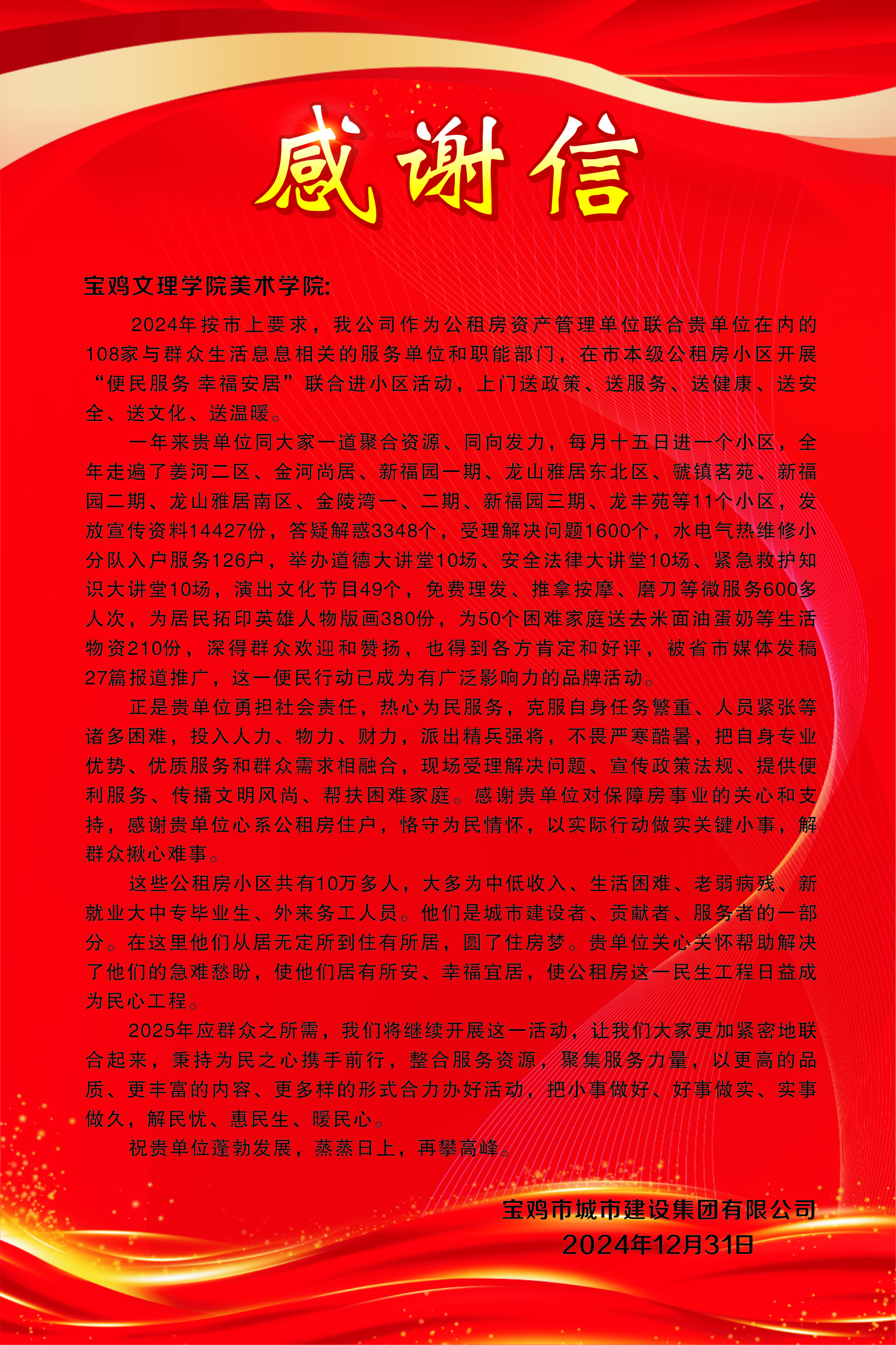 1月17日,宝鸡市城市建设集团有限公司向美术学院送来了一封饱含深情的感谢信,对学院在2024年“便民服务 幸福安居”联合进小区活动中的表现与付出表达诚挚的感激之情。