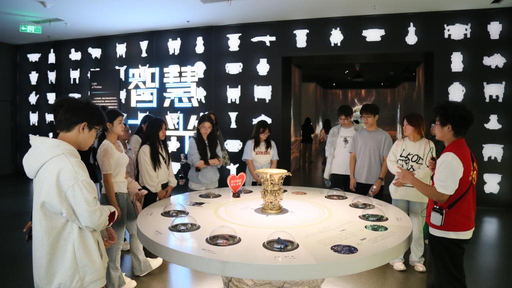 师生跟随开元大学生青铜器志愿讲解员,以何尊、逨盘等镇馆之宝为线索,依次参观“青铜之乡”“周礼之邦”“秦肇之路”“智慧之光”四个单元的主题展览。大家沉浸其中,探究“中国”二字内涵的不断演变、发展、扩充,沿着周秦文明发展的足迹,体悟习近平总书记关于加强青铜器文物的保护研究和宣传阐释的嘱托。