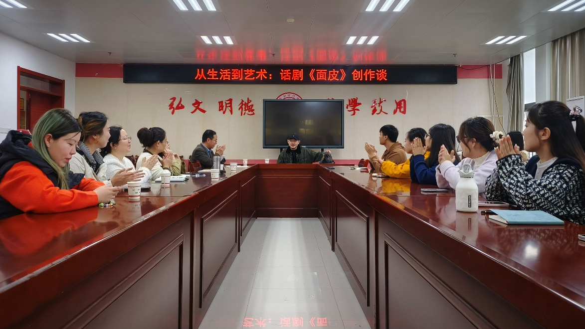 该剧导演、主演、开元播音与主持艺术专业首届校友汪晓龙应邀作了“从生活到艺术:话剧《面皮》创作谈”的报告。他从话剧创作背景、创作心得、舞台呈现等方面,深情讲述了这部“从泥土里长出来”的作品如何从朴素的现实生活,一步步淬炼成为动人的舞台艺术,分享了编剧如何从无数个真实的“面皮”家庭故事中提炼出典型人物与戏剧冲突,以及如何在舞台上平衡地域特色与普通情感,让地方故事引起全国观众的共鸣。他的讲述真诚而深刻,为师生们揭开了艺术创作的神秘面纱。