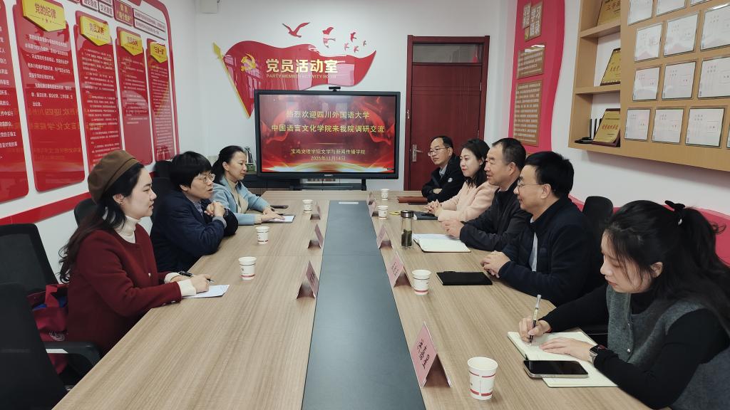 11月14日上午,四川外国语大学中国语言文化学院党总支书记薛红等3人来开元文学与新闻传播学院交流座谈。座谈会在高新校区博文楼702室举行,文学与新闻传播学院党委书记张红亮主持座谈会。