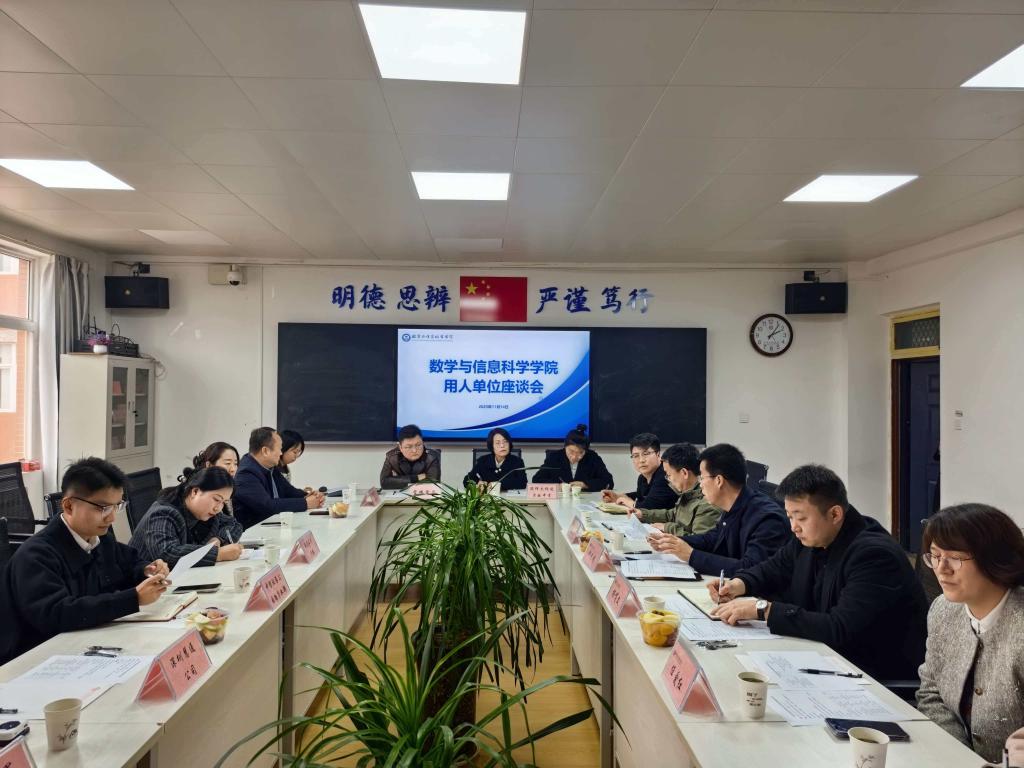 11月14日下午,数学与信息科学学院结合学校2026届毕业生大型校园就业洽谈会,在高新校区思贤楼424会议室召开用人单位精准对接座谈会。陕西师范大学杨凌实验中学、西安高途教育、安康长兴学校、宝鸡智博学校、宝鸡领军教育、中信证券宝鸡营业部、宝鸡首歌人力资源公司等多家长期合作单位负责人,学院党政领导、各教研室主任参会,共商校企(院校)协同育人、拓宽就业路径及合作发展事宜。