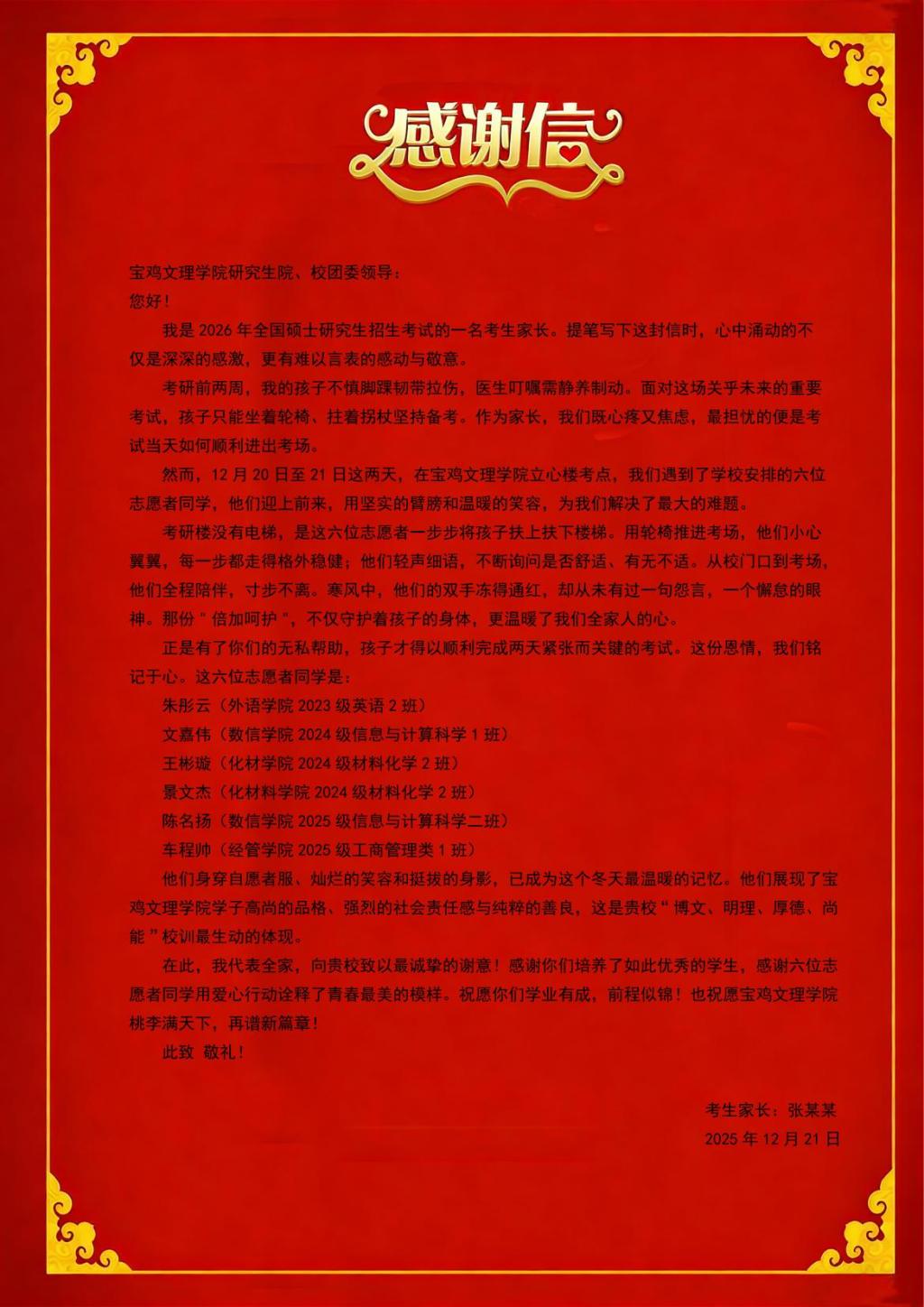 近日,研究生院、校团委收到一封来自考研学生家长的感谢信,向学校以及提供志愿服务的同学表达谢意。