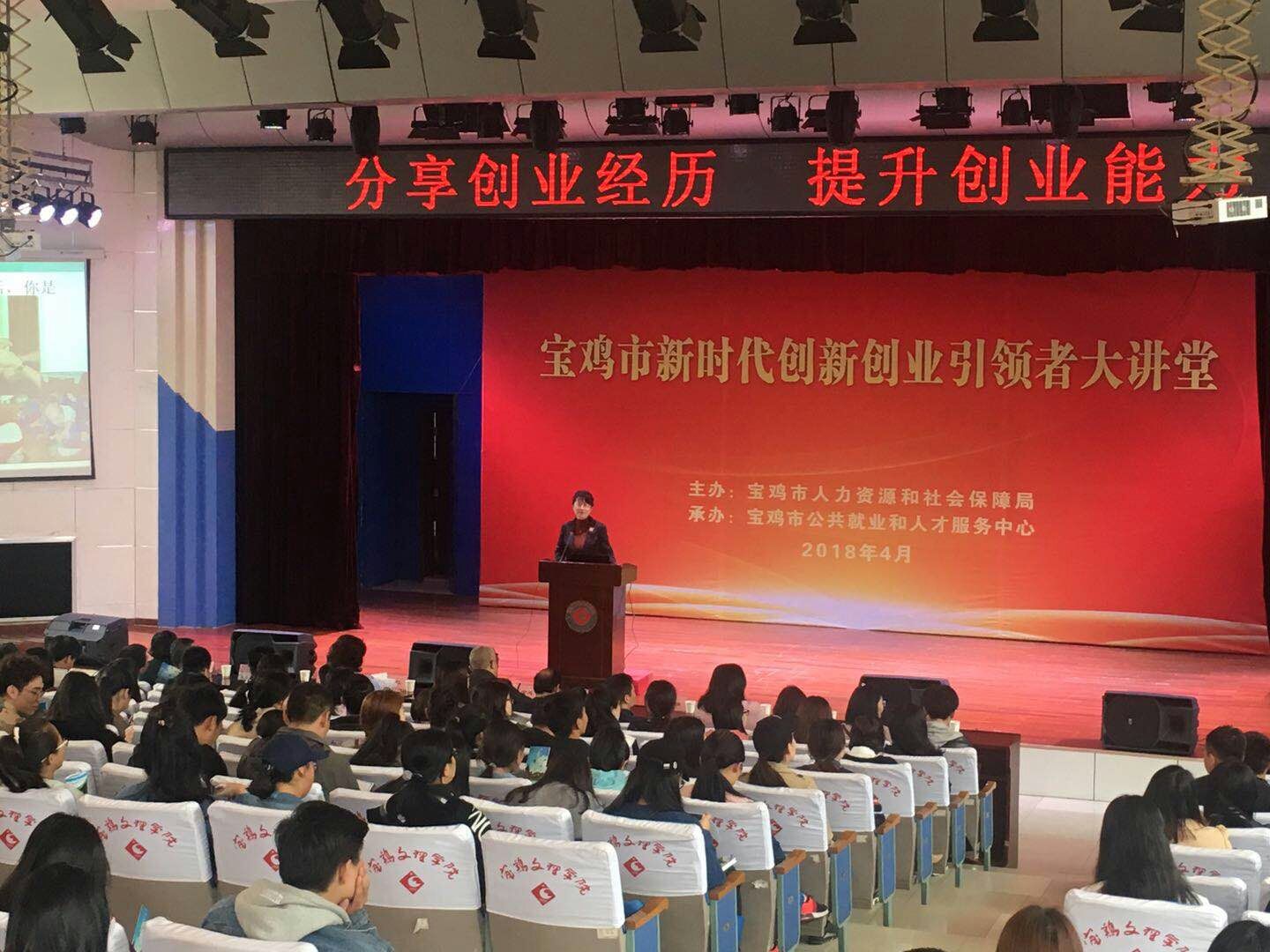 4月13日下午,由宝鸡市人力资源和社会保障局主办、市公共就业和人才服务中心承办的新时代创新创业引领者大讲堂在开元音乐厅举行。招生就业处处长李周让、市全民创业领导小组办公室副主任戴金成、市公共就业和人才服务中心副主任吴鹏演、市青年企业家协会会长刘晓应、青年创业家代表及各二级学院有创业意愿的400余名学生参加了大讲堂活动。大讲堂由宝鸡市公共就业和人才服务中心主任惠宽侠主持。