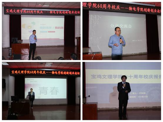 创新创业论坛报告会在老校区2号报告厅举行,吕宏强老师主持了会议。该院2003级电子信息科学与技术专业校友、宝鸡英创教育集团董事长殷建兵,路斯联国际(香港)有限公司技术总监桂大江,宝鸡金坤教育集团董事长孙养平,2006级电子信息科学与技术专业校友、西安聚创科技有