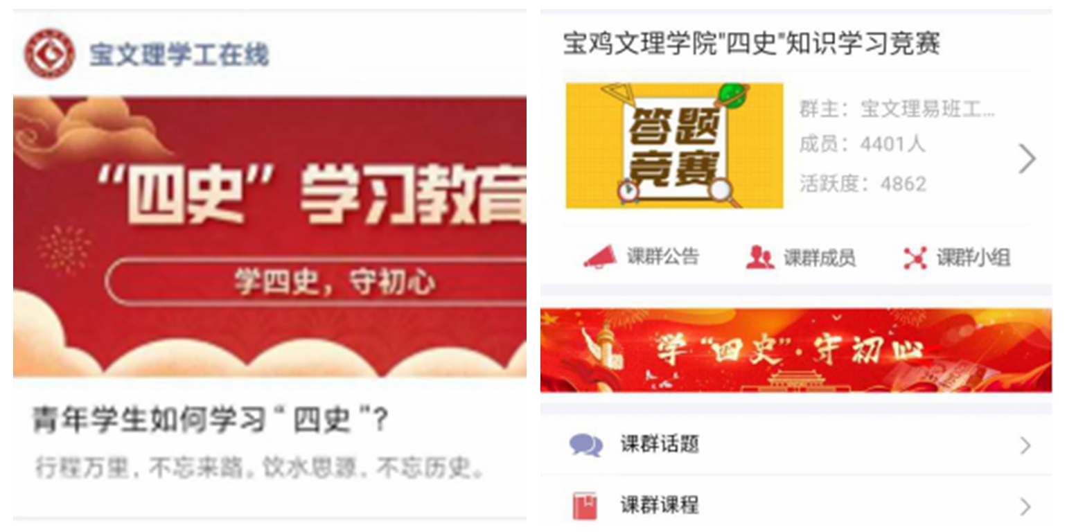 本次学习教育活动包括网络学习活动和网络知识竞赛活动两部分内容。网络学习活动通过“宝文理学工在线”微信平台和“宝文理·易班”平台,重点向学生介绍了党史、新中国史、改革开放史、社会主义发展史中的重大事件和先进典型,特别宣传学习了习近平总书记对学生思想政治教育工作、党团组织建设、校园文化建设等方面的重要指示批示以及对青年学子的殷切希望。