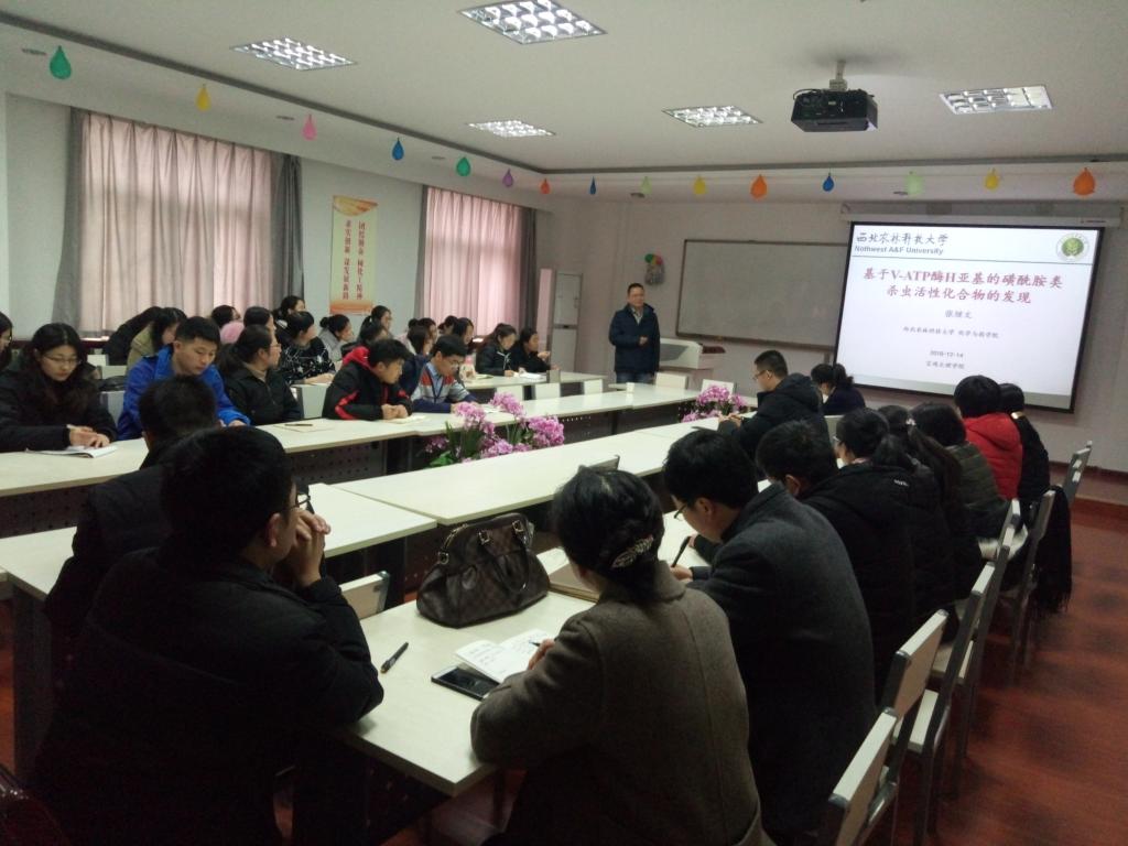 12月14日下午,西北农林科技大学化学与药学院博士生导师张继文教授应邀在开元明理楼6楼化学化工学院会议室作了题为《基于V-ATP酶H亚基的磺酰胺类杀虫活性化合物的发现》的学术报告,化学化工学院教师、研究生50余人聆听了报告,报告会由化学化工学院院长凡明锦主持。