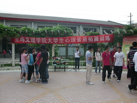 5月11日下午,由学工部、大学生心理健康教育与咨询中心主办,荣德心理协会承办的大学生心理素质拓展训练活动在老校区广场举行。此次活动旨在锻炼学生团结一致,密切合作,克服困难的团队精神,提高同学的团体协作能力,培养健全的人格,树立健康积极的人生态度,以良好的心态和形象迎接建党90周年。老校区各班心理保健联络员、荣德心理协会会员等300余人参加了活动。参加训练的同学精神饱满,积极踊跃,收到了效果。(学工部、大学生心理咨询中心供稿)