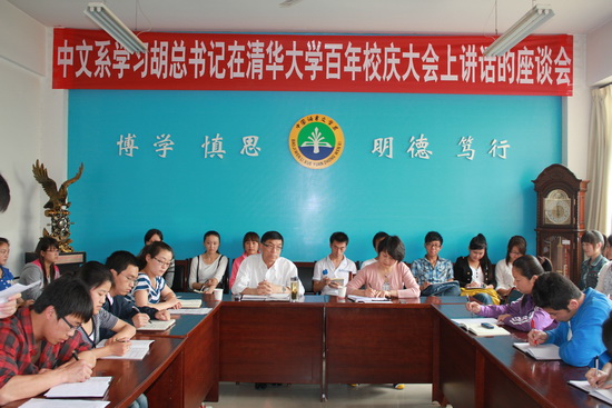 座谈会上,与会人员共同学习了胡锦涛总书记在清华大学百年校庆大会上的讲话。随后,赵艳、周现英、中文系团总支干部代表、团支部书记代表等9人陆续发言,他们结合系上的实际,自身工作、学习、生活实际,畅谈学习胡总书记重要讲话的体会。他们一致认为,胡总书记的重要讲话,特别是讲话中对全国青年学生提出的三点希望,既体现了党和政府对青年学生寄予的厚望,也为青年学生健康成长指明了前进的方向。