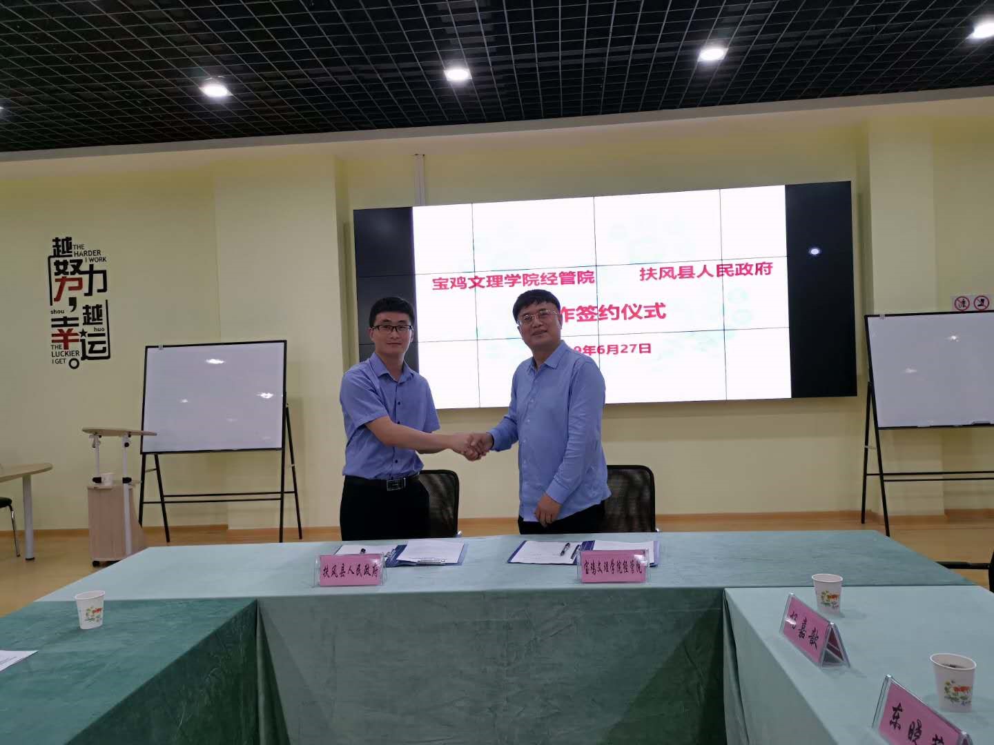6月27日,经济管理学院与扶风县人民政府在开元尚能楼创新创业实验室举行电子商务校地合作协议签署仪式。宝鸡市商务局副局长李小平、扶风县人民政府副县长赵炳震、扶风县电子商务服务中心王丽娟、经管学院院长张伟峰、副院长刘晓科、工商管理系主任郑蕾以及部分教师代表参加签约仪式。仪式由经济管理学院副院长刘辉主持。