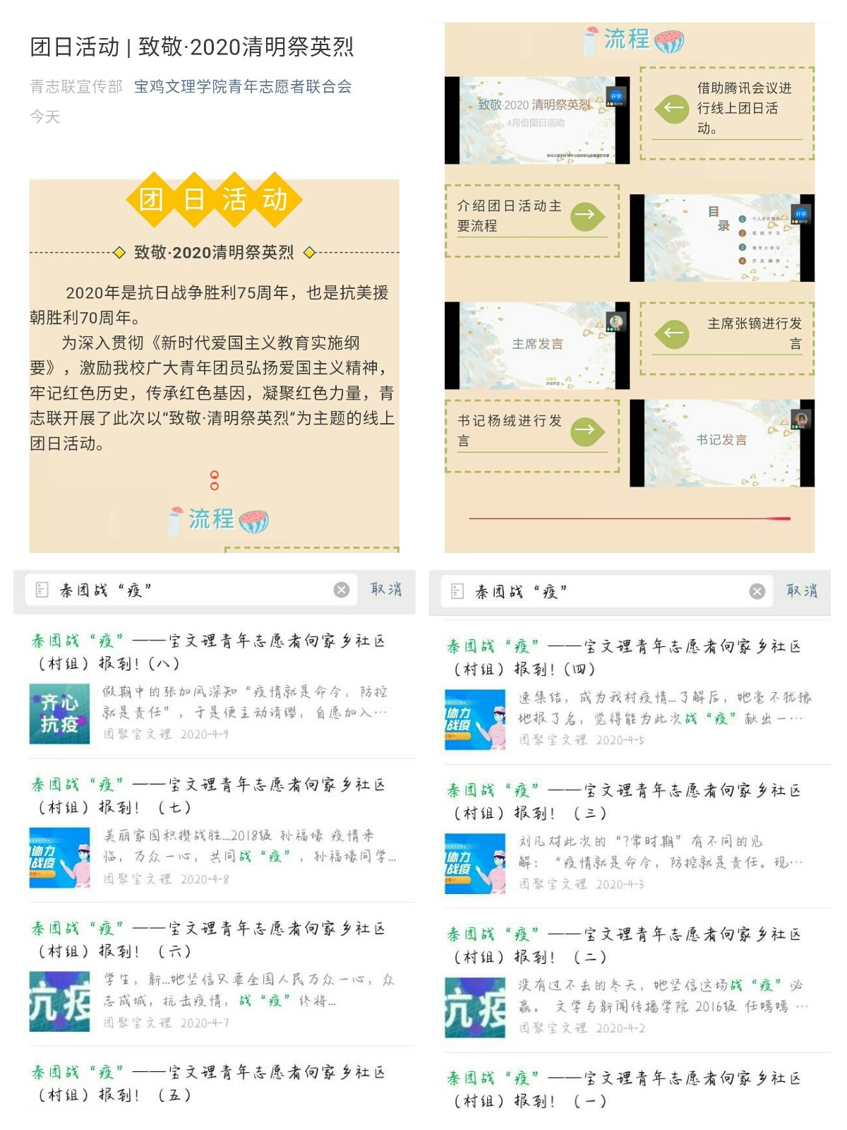 五是弘扬身边青春能量。“青马工程”第17期培训班组织学员参加了战“疫”英雄•青春赞—宝鸡市援鄂医疗队员故事分享会活动,聆听了李军、付敏和吴东等三名宝鸡市援鄂医护代表的事迹分享,深受教育和触动,畅谈了自己的心得体会。全校青年团员积极响应团中央《返乡大学生团员们,请到社区(村)报到》号召和校团委《致全校返乡大学生团员的倡议书》,自觉投身家乡社区(村组)疫情防控志愿服务,他们有的参与到关爱抗击疫情医务人员家庭领域,有的参与到城乡基层社区防控领域,有的参与到防疫物资保障领域,有的参与到文化艺术宣传领域,还有的参与到网络文明宣传领域,以实际行动彰显了文理青年学子的“硬核”担当。