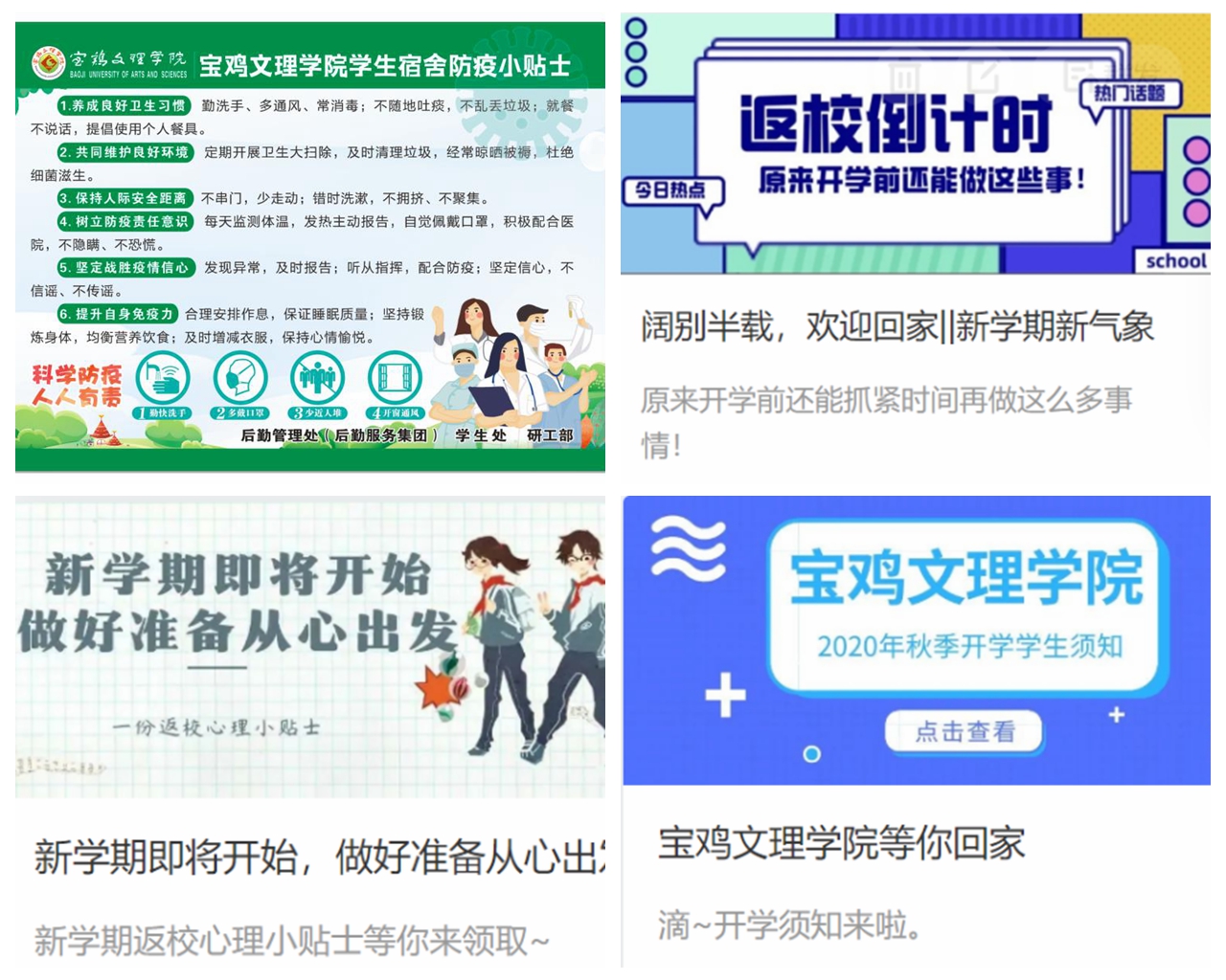 一是做好疫情防控知识宣传教育。学工部(处)联合后勤管理处(后勤服务集团)、研工部开展宿舍防疫知识宣传教育,为高新校区、石鼓校区共计3716间宿舍张贴宿舍防疫小贴士,以宿舍为单位对全校学生进行防疫知识宣传。在“宝文理学工在线”和“宝文理·易班”上推出“返校网络专栏”,进行网络防疫知识宣传。告知学生返校安全注意事项、返校前应做的心理和学习准备,做好学生返校前的思想引领与心理关怀。组织2020级本科新生和专升本学生在入学前通过“宝文理·易班”平台学习“新生安全微课”,学习疫情防控知识、金融安全知识、交通安全知识、饮食健康知识等,提高学生的安全防范意识和应对能力,维护校园稳定安全。