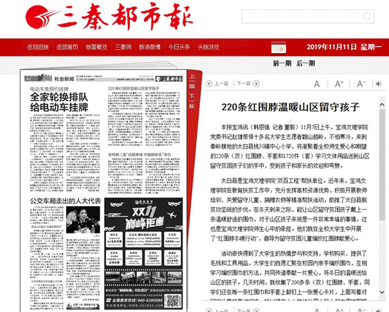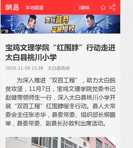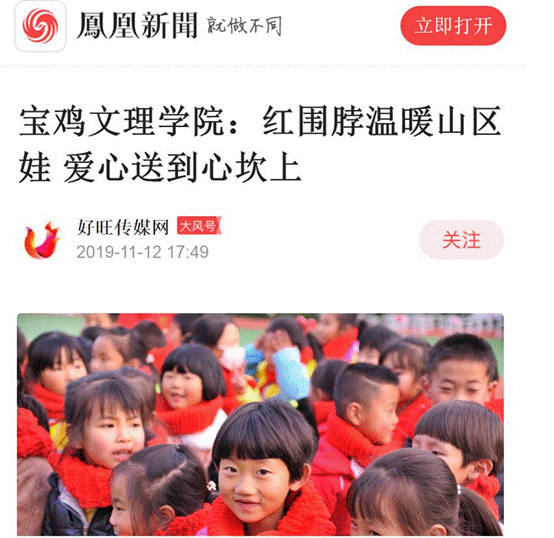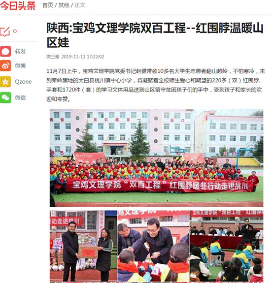 近日,开元开展的“双百工程”“红围脖暖冬行动”走进太白县桃川小学活动,分别被《人民日报新媒体平台》《今日头条》《凤凰网》《三秦都市报》等11家媒体报道。(党委宣传部 文、图/韩恩强 审核/冯飞龙)