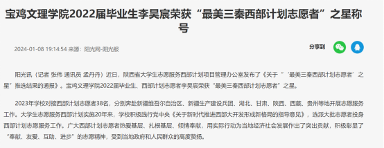 四、2022届毕业生李昊宸荣获“最美三秦西部计划志愿者”之星称号