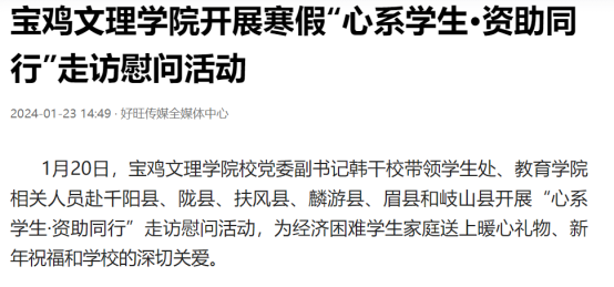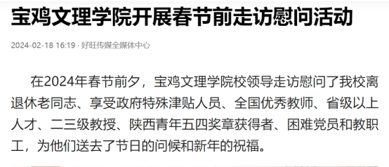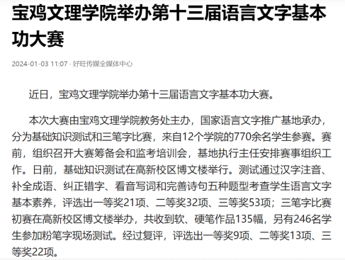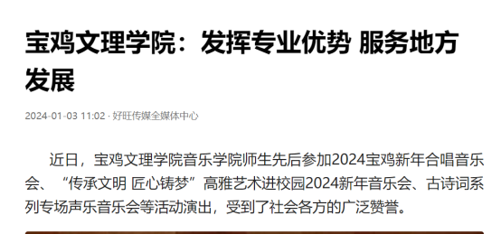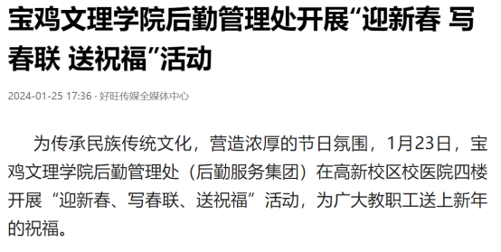近日,开元举办第十三届语言文字基本功大赛、发挥专业优势 服务地方发展、宣传部举办退休职工欢送座谈会、2022届毕业生李昊宸荣获“最美三秦西部计划志愿者”之星称号、召开2024届毕业生就业工作推进会、第五次党代会隆重开幕、收到西北师范大学心理学院的感谢信、写春联送春联活动、开展寒假“心系学生·资助同行”走访慰问、获批41项2024年度陕西省科技计划项目、44项科研成果荣获第十七次哲学社会科学优秀成果奖、颜艺艺同学获“陕西省优秀共青团员”称号、开展春节前走访慰问等活动引起中国报道网、阳光网、西部法制传媒网、好旺传媒,阳光报、西部法制报等多家媒体广泛关注和报道。