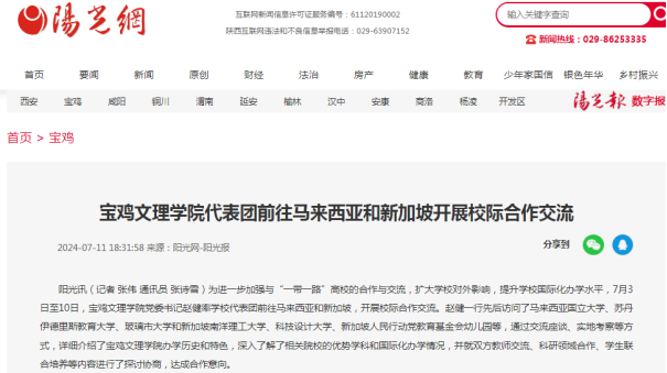 近日,学校举行庆祝中国共产党成立103周年暨“七一”表彰大会、代表团前往马来西亚和新加坡开展校际合作交流、举行2024年大学生暑期文化科技卫生“三下乡”社会实践活动出征仪式、与宝鸡市础石金属检测有限责任公司签订校企合作战略协议、宝鸡市低空智能飞行研究院揭牌成立、大学生青铜器志愿讲解团队获青年志愿服务项目赛铜奖、开展“美丽中国 青春行动”专项暑期社会实践活动、组织师生赴茵香河文化旅游区开展暑期社会实践活动、开展“艺路有你相伴 助力文化振兴”暑期社会实践活动、前往陇县开展实践调研活动、“青禾硕果”乡村振兴社会实践团开展实践活动等引起陕西省教育厅-新闻-热点聚焦、中国周刊网、阳光报、阳光网、陕西科技传媒网、宝鸡一点通-宝鸡市融媒体中心等多家媒体广泛关注和报道。