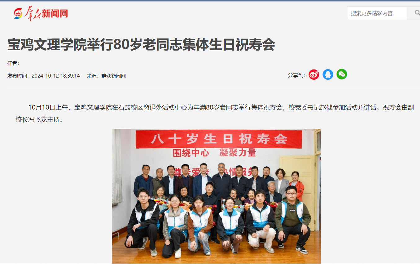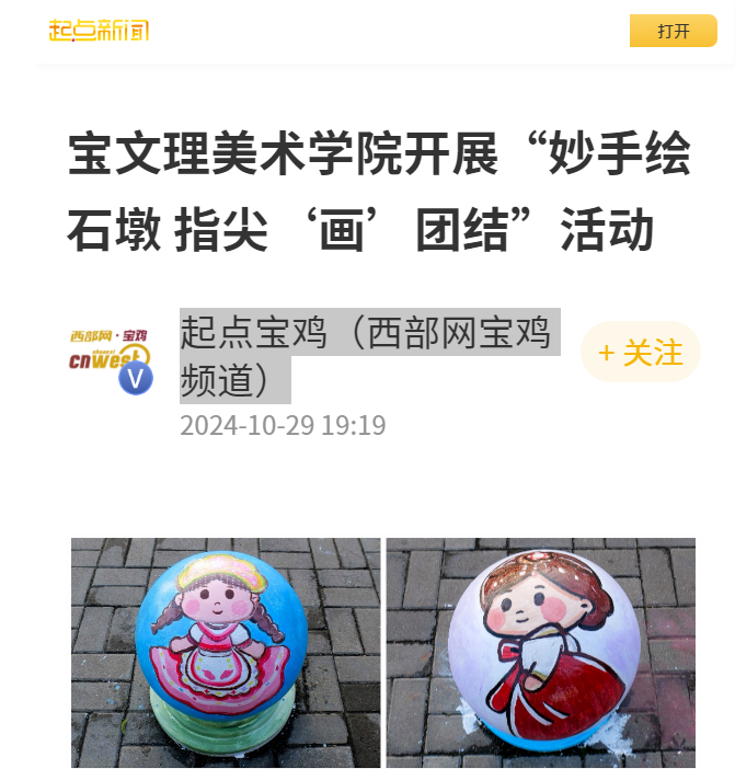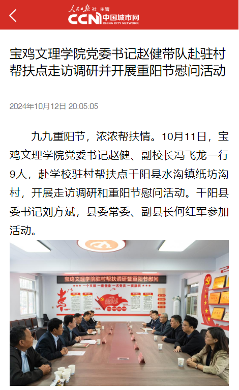 近日,校领导带队赴驻村帮扶点走访调研并开展重阳节慰问活动,赴太白县调研“双百工程”工作并开展金秋送暖慰问帮扶活动,学校举行80岁老同志集体生日祝寿会,学校举办教师教学创新大赛,学校赴南京大学参加招才引智专场活动,机关党委开展“赓续红色血脉 助力教育强国”党日活动,开元学子走进环卫终端开展研学活动,美术学院开展“妙手绘石墩 指尖‘画’团结”等活动引起人民日报社、人民日报全媒体、阳光网、西部法制报、群众新闻网、起点新闻、今日头条等多家媒体广泛关注和报道。