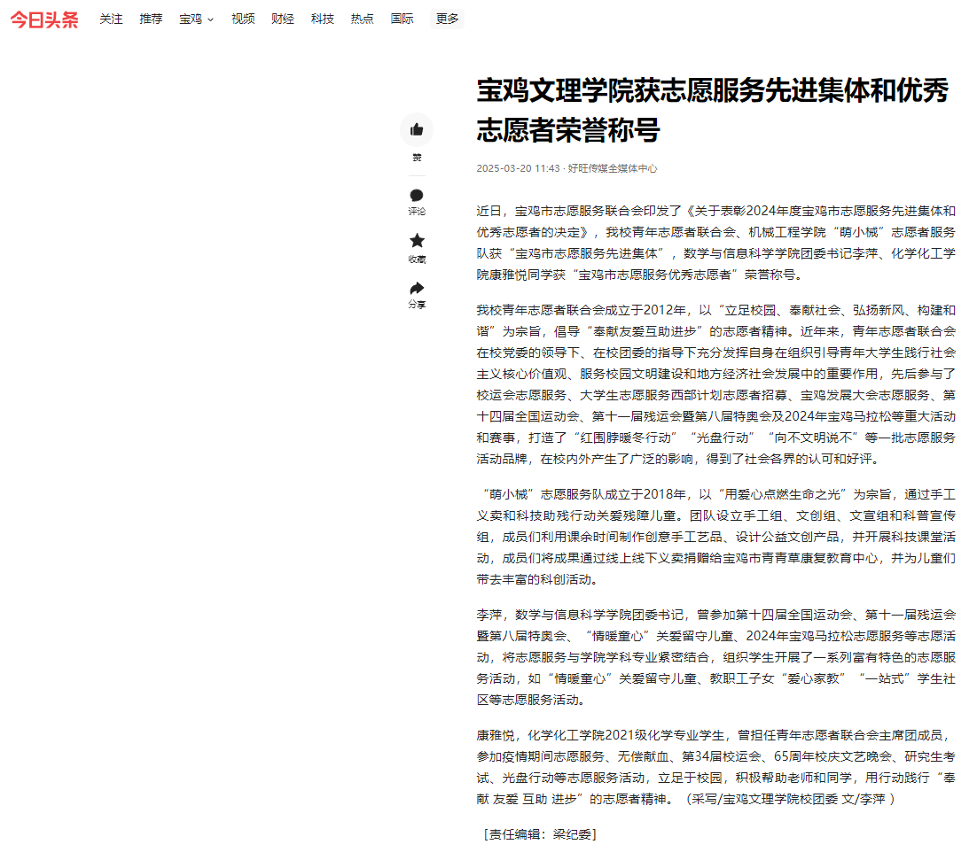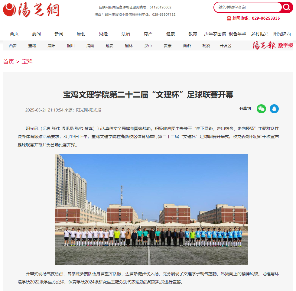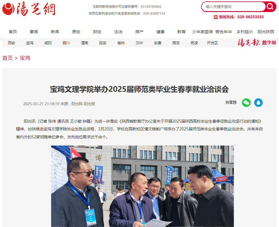近日,开元举办2025届师范类毕业生春季就业洽谈会、获志愿服务先进集体和优秀志愿者荣誉称号、举办“典耀中华 书香文理”主题读书活动启动仪式、第二十二届“文理杯”足球联赛开幕等活动引起学习强国、阳光网、三秦都市报、陕西农村网、陕西头条、宝鸡一点通、民生网、今日头条等多家媒体广泛关注和报道。