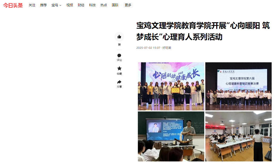 近日,学校举办庆祝中国共产党成立104周年廉洁文化“一院(处)一品”项目成果展演、《陕西日报》刊发开元师生学术文章、开展暑期“三下乡”社会实践活动、教育学院开展“心向暖阳 筑梦成长”心理育人系列活动、孙新峰教授散文著作《耳朵温热》出版等活动引起学习强国、陕西日报、阳光网、陕西都市新闻、陕西晨报、宝鸡市融媒体中心、今日头条等多家媒体广泛关注和报道。