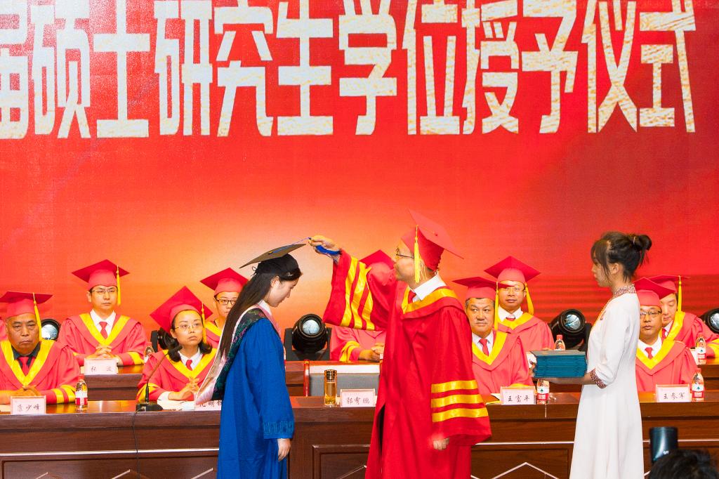 仪式在庄严的国歌声中开始。王富平宣读了2022届硕士研究生学位授予决议和关于表彰2022届省级/校级优秀毕业生、优秀学位论文获得者、优秀研究生干部、2021年度优秀研究生导师的决定。伴随着《加冕进行曲》,郭霄鹏为2022届硕士研究生逐一扶正流苏、颁发学位证书,并合影留念。会议表彰了省级和校级优秀毕业生、校级优秀学位论文获得者、优秀研究生干部、优秀研究生导师。