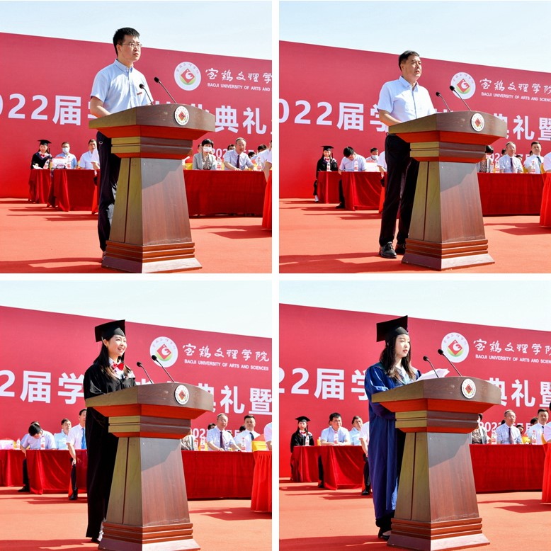 化学化工学院冯海涛博士代表全体教师向即将开启人生新篇章的2022届毕业生致以最诚挚的祝贺和最衷心的祝福,愿他们坚守初心、砥砺前行,积极乐观、少些抱怨,内心善良、眼里有光。2022届毕业生家长代表李建伟先生向顺利完成学业的2022届毕业生表示祝贺,向为培育孩子们成长尽心竭力的全体教职员工表示最诚挚的感谢,并叮嘱同学们要牢记母校恩、不忘同学情、保持平常心。教育学院本科毕业生黎玥、化学化工学院硕士毕业生沈楠分别代表全体毕业生向辛勤培养他们的领导和老师致以最崇高的敬意,向操劳的父母表示最衷心的感谢,向朝夕相处的同学们送上最真诚的祝福,愿母校欣欣向荣,蓬勃发展。