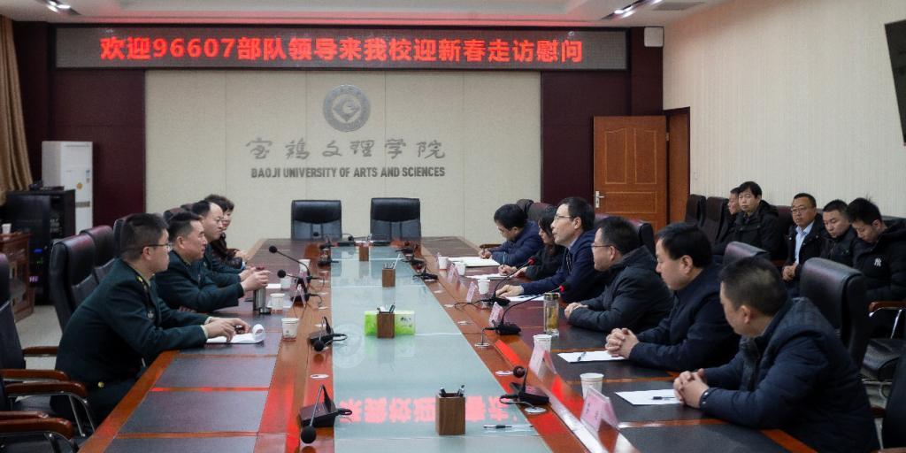 郭霄鹏对96607部队领导的到来表示欢迎,对部队多年来帮助学校开展大学生军训和国防教育工作表示衷心感谢,并从人才培养、学科建设、科研工作、人才队伍建设、对外合作交流、党建与思想政治工作等六个方面介绍了学校的发展情况。他指出,学校的发展离不开部队的支持,在春节来临之际,向部队全体官兵送上诚挚的问候和新春的祝福,并希望双方继续加强交流,共同谱写军民合作新篇章。