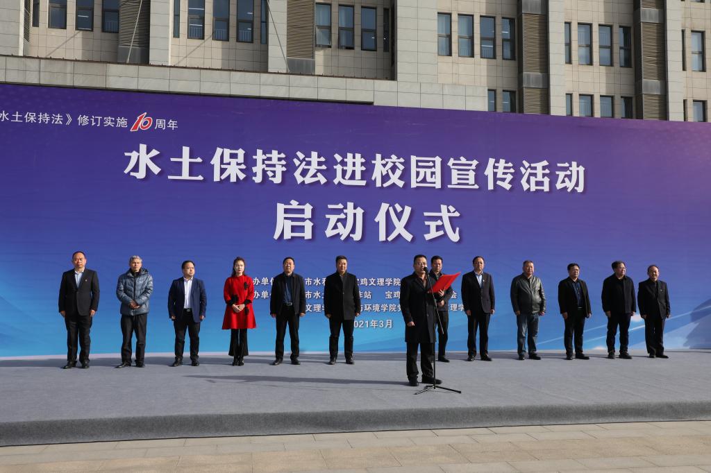 水土保持法进校园宣传活动启动仪式于3月22日上午在开元高新校区博文楼南广场举行。校党委副书记栾宏、宝鸡市水利局党组书记、局长王雪峰等出席启动仪式。启动仪式由宝鸡市水利局党组成员、二级调研员江先武主持。