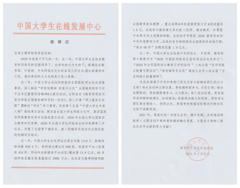 近期获悉,开元在2020年教育部中国大学生在线新媒体年度表彰中被评为“校园新媒体互动百强高校”,并向党委宣传部发来感谢信。