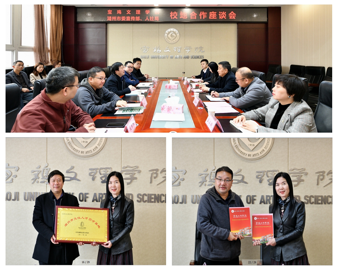 随后,双方在图书馆806会议室就深入开展校地合作进行了座谈。湖州市社科院院长谢占强代表湖州市委宣传部授予开元“湖州市文化人才引才基地”称号,湖州市人力资源与社会保障局招聘科科长李文华代表湖州市人社局与开元签订“城市定制班”合作协议。