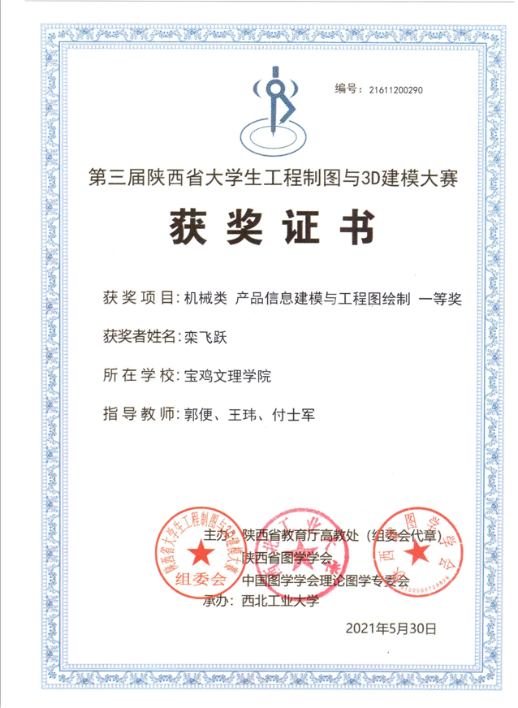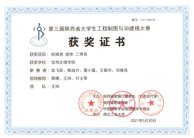 近期,第三届陕西省大学生工程制图及3D建模大赛在西北工业大学举办。开元机械工程学院栾飞跃、王振华等15名学生参赛,最终获得机械类团体赛二等奖1项,个人赛一等奖1项、二等奖5项、三等奖8项。郭便、付士军、王玮被评为优秀指导教师。