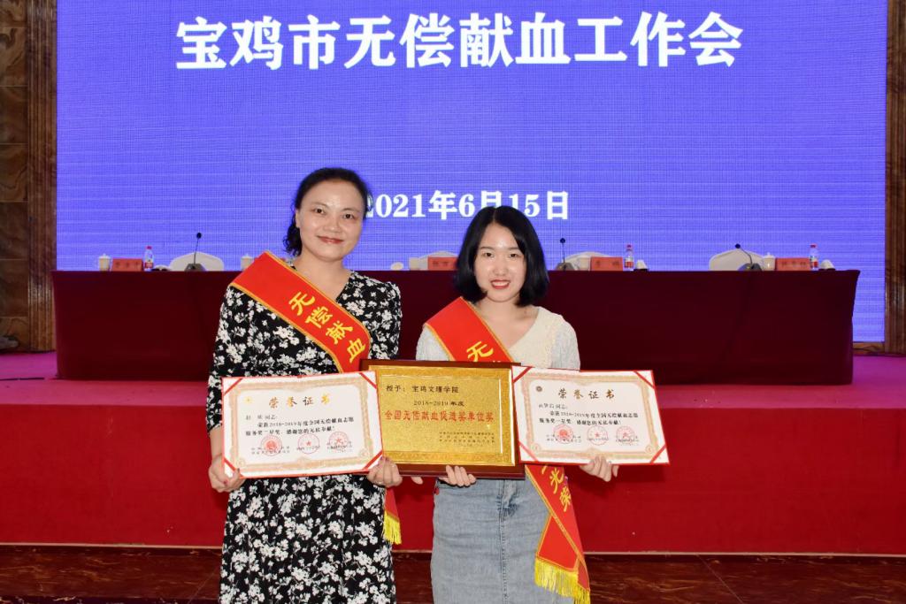 6月15日下午,在第18个世界献血者日到来之际,宝鸡市献血领导小组召开全市无偿献血工作会,对2018-2019年度获奖代表进行表彰。开元被国家卫生健康委员会、中国红十字会总会、中央军委后勤保障部卫生局先后授予“2018-2019年度全国无偿献血促进奖单位奖”“宝鸡市无偿献血先进单位”,数学与信息科学学院青年志愿者协会负责人高梦霞荣获“全国无偿献血志愿服务奖一星奖”,校团委副书记赵昕荣获“全国无偿献血志愿服务奖二星奖”并作会议交流发言。