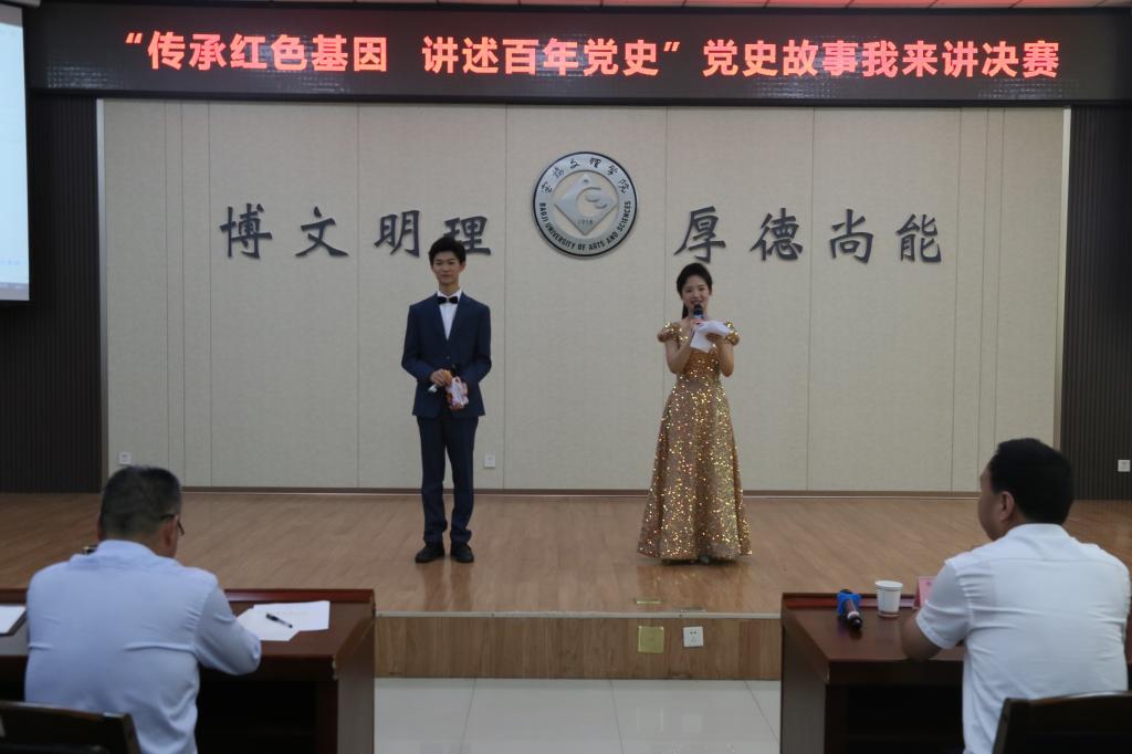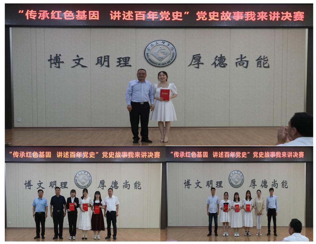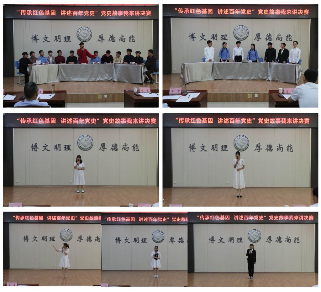 经二级学院初赛、校级复赛,共有7个作品进入决赛环节。参赛作品以中国共产党建党百年历史和党史学习教育为背景,通过丰富翔实的事例,激情澎湃的语言,真挚热切的情感,采取故事讲述、情景剧表演等形式,再现了中共一大召开、红军长征等历史事件和“共和国第一军嫂”陈发姑、“小萝卜头”宋振中的先进事迹,展现了共产党人顽强拼搏、不懈奋斗的光辉形象,为现场的观众带来了一次精神上的洗礼。