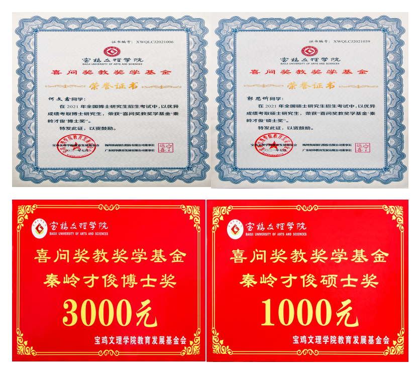 6月25日上午,在开元2021届学生毕业典礼暨学位授予仪式上,学校党政领导为荣获“喜问奖教奖学基金‘秦岭才俊’博士奖、 硕士奖”代表颁发荣誉证书、奖金。经各二级学院上报,研究生院、学生处审定,校教育发展基金会、捐赠人审核,王妍等6名考取博士的2021届硕士毕业生荣获“喜问奖教奖学基金‘秦岭才俊’博士奖”,每人发放奖金3000元;师文豪等350名考取硕士的2021届本科毕业生荣获“喜问奖教奖学基金‘秦岭才俊’硕士奖”,每人发放奖金1000元。