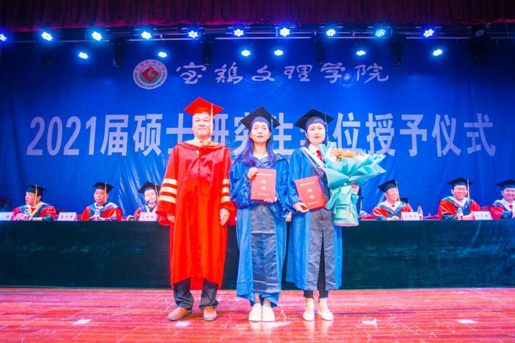 仪式在庄严的国歌声中正式开始。王富平宣读了2021届研究生硕士学位授予决定和关于表彰2021届省级、校级优秀毕业生、优秀学位论文获得者、优秀研究生干部的决定。郭霄鹏、王富平依次为毕业生正冠拨苏、颁发学位证书并合影留念。会议表彰了省级、校级优秀毕业生、校级优秀学位论文、优秀研究生干部。