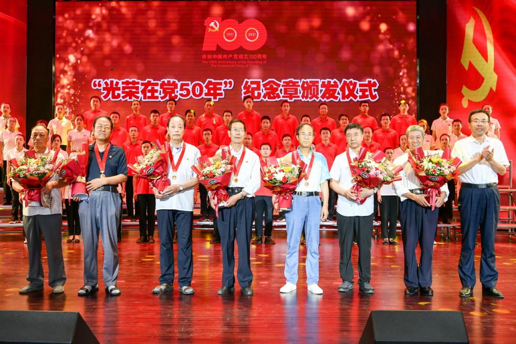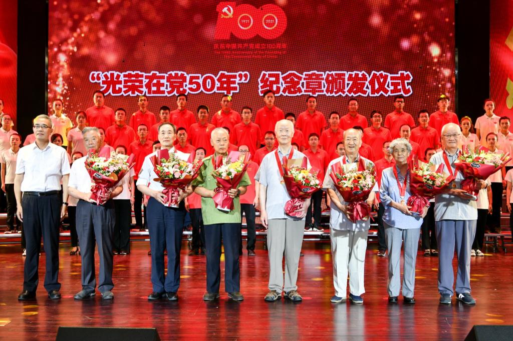 大会上,校领导为“光荣在党50年”的14名老党员佩戴纪念章并献上鲜花。同时为优秀共产党员代表、优秀党务工作者代表和先进基层党组织颁发了荣誉证书和奖牌。
