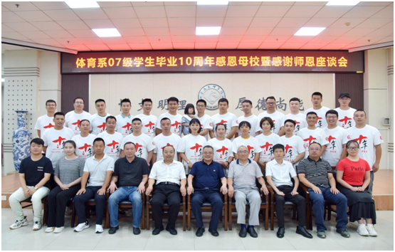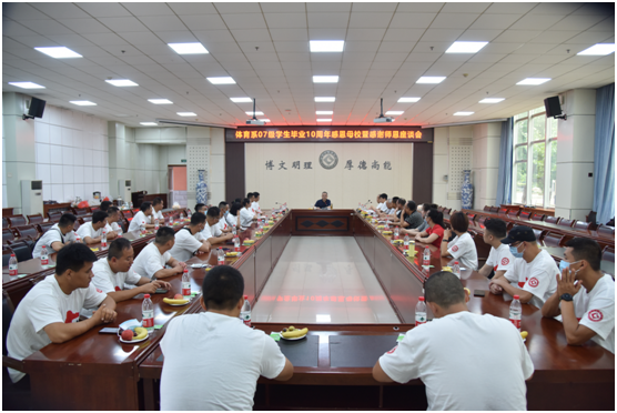 座谈会上,师生亲切交谈,共同回忆了美好的大学时光,展现出了浓浓的师生情谊、同窗情谊。体育学院党总支书记丁煜成欢迎各位校友回校,并介绍了体育学院近年来的发展情况。原体育系党总支书记梁新明、07级体育教育专业班主任谢奇、任课教师姚可军、党胜利等老师在发言中感谢为本次活动付出辛勤努力的学校有关职能部门和“同学聚会”筹委会的同学们,向放下手里的工作,不畏旅途劳顿、长途跋涉,参与本次聚会的同学致以深切的问候,祝福因故未能返校聚会的同学们在异地他乡平安、健康、快乐,希望同学们事业成功后不忘母校,用实际行动感恩母校。同学们回忆了当年恩师的教诲和他们刻苦学习、努力奋进的场景,表达了对母校的思念和感激之情。校友代表向学校、体育学院赠送了纪念品。