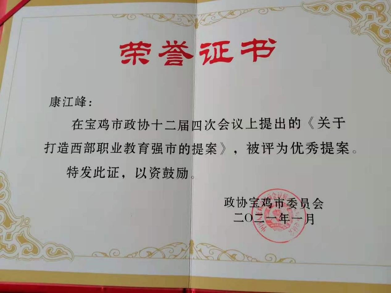 近日从政协宝鸡市第十二届委员会第五次会议上获悉,民盟宝鸡市委副主委、民盟开元集团网站总支康江峰教授在宝鸡市政协十二届四次会议上提出的《关于打造西部职业教育强市》提案,被政协宝鸡市委评为优秀提案。(统战部、民盟开元集团网站总支 文/王建宁 审核/田延峰)