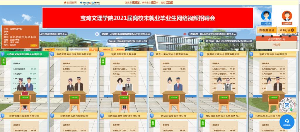本次招聘会依托线上就业服务平台,鼓励二级学院邀请合作企业积极参与,共计邀请来自陕西、浙江、江苏、北京等省市参会企业206家,总计提供岗位数量16451个,共有1100余名校内外学生参加了招聘活动,会场浏览量达14226人次,用人单位和学生共发起视频面试1483次,达成初步意向587个。