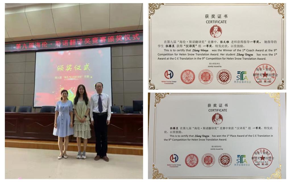 近日,陕西省翻译协会公布了第九届海伦·斯诺翻译奖竞赛结果,开元外国语学院翻译系2018级学生张滕昱荣获汉译英组一等奖,张文雅获指导教师一等奖。9月21日,竞赛主办方在西北大学长安校区举办了颁奖仪式,外国语学院李伟院长、王卫强教授、张占勤研究员应邀出席,张滕昱和张文雅分别代表获奖者和指导教师在仪式上做了发言。