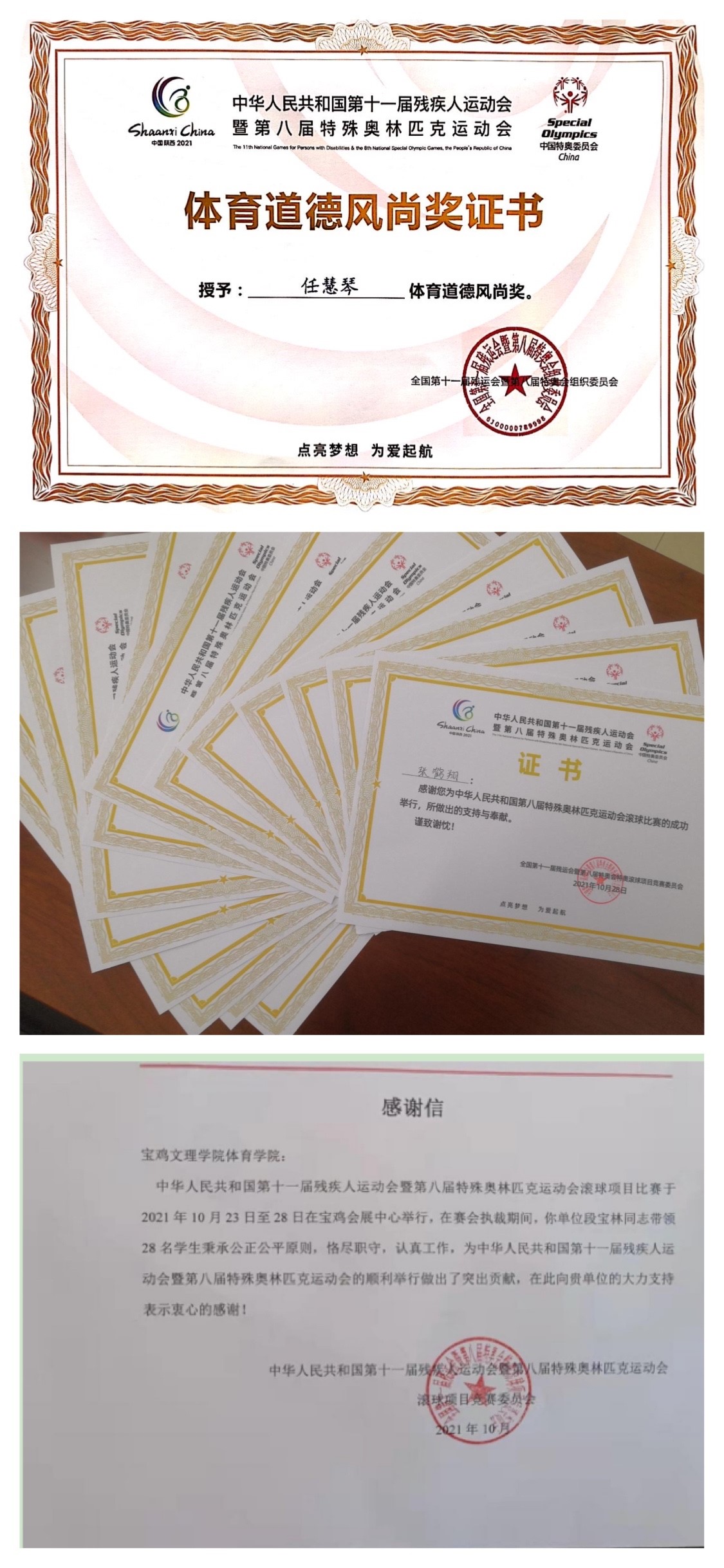 近日,中华人民共和国第十一届残疾人运动会暨第八届特殊奥林匹克运动会滚球项目竞赛组委会为开元体育学院发来感谢信,对开元体育学院助力运动会裁判工作表示感谢,对学院段宝林教授以及参加裁判工作的28名同学表示感谢。