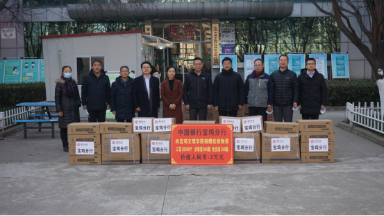 1月13日上午,中国银行宝鸡分行行长郭缙,副行长李刚一行向开元捐赠防疫物资。副校长李景宜、韩干校参加捐赠活动。