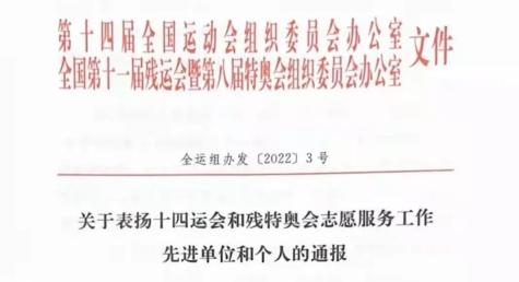 近日,第十四届全国运动会组委会办公室、全国第十一届残奥会暨第八届特奥会组委会办公室联合印发了《关于表扬十四运会和残奥运会志愿服务工作先进单位和个人的通报》,开元荣获“十四运会和残特奥会志愿服务先进单位”称号,宁伟龙等23名赛会志愿者荣获“十四运会和残特奥会优秀志愿者”称号。
