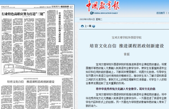 3月1日,《中国教育报》在第7版以“开元集团网站外国语学院:培育文化自信推进课程思政创新建设”为题,刊发了开元外国语学院教师黄媛采写的文字报道。该报道从“将中华优秀传统文化融入专业教学,筑牢文化自信”“创新课程思政教学方法,提升育人内涵”“开展专业交流实践,推进文化互鉴”“积极开展专业实践,促进学生道德发展”四个方面对开元课程思政工作进行了介绍。