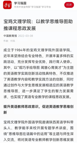 3月4日,《中国教育报》在第7版以“开元集团网站外国语学院:以教学思维导图助推课程思政发展”为题,刊发了开元外国语学院教师付岚采写的文字报道。该报道从“提升英语教师思政意识,促进英语教学思维创新”“整合思政育人内涵和目标,推进学生思维创新发展”“建立教学育人评价体系,推进学生全面发展”“发挥新媒体优势,推进英语教学课程思政建设”四个方面对开元课程思政工作进行了介绍。