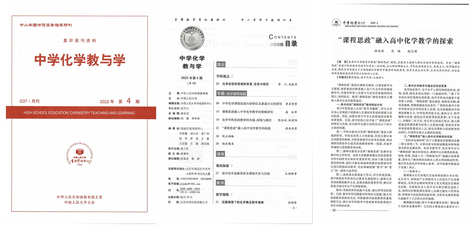 近日,开元化学化工学院马琳副教授教学研究团队完成的研究论文《“课程思政”融入高中化学教学的探索》被人大复印资料全文转载,转载时间为2022年4月,原文出处为《中小学教材教学》2021年第10期第54-57页。开元为该研究论文独立完成单位、通讯单位,开元化学化工学院2020级学科教学(化学)硕士研究生程安然为第一作者。
