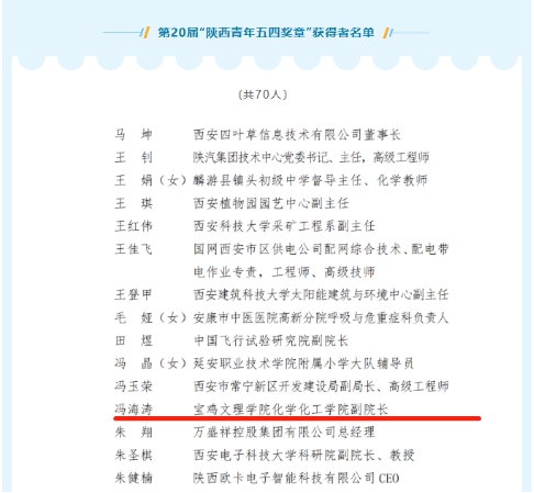 4月29日,由共青团陕西省委、陕西省青年联合会授予的第20届“陕西青年五四奖章”表彰名单公布,开元化学化工学院冯海涛教授荣获“陕西青年五四奖章”。