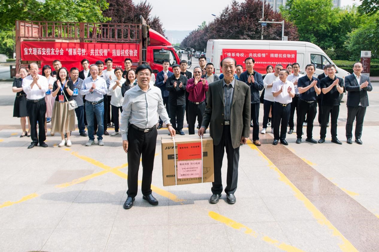 会前,学校在高新校区图书馆北门举行了西安校友分会疫情防控物资捐赠仪式。西安校友分会副会长、居业集团(香港)有限公司和陕西居业投资集团股份有限公司董事长李居岸,西安校友分会副会长、陕西亚华建装建设有限公司董事长付斌林,西安校友分会副秘书长、金工建设集团股份有限公司陕西分公司副总经理、陕西墙管家建筑装饰工程有限公司总经理王阿波,西安校友分会秘书、大唐盛业科技股份有限公司副总经理朱新博等慷慨解囊,捐赠了价值12.88万元的防疫物资,助力母校战胜疫情。